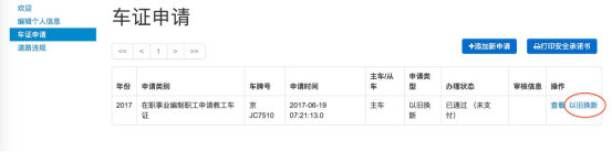 a.若要申请新车证则点击“添加新申请”,若以旧换新点击“以旧换新”。