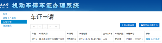 e.回到“车证申请”页面,出现如下界面