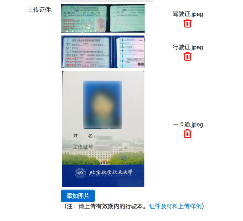à上传证件时点击“添加图片”,上传系统提示的“材料清单”中需要的所有图片文件。
